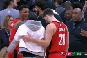 1. 老队友了!小贾巴里和申京赛后和小凯文·波特寒暄叙旧