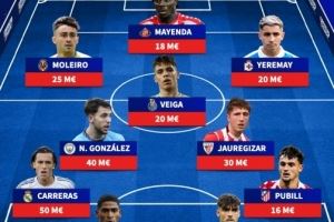 后卫:卡雷拉斯(皇马,5000万欧)、莫斯克拉(阿森纳,3500万欧)、阿森西奥(皇马,3000万欧)、普比尔(马竞,1600万欧)